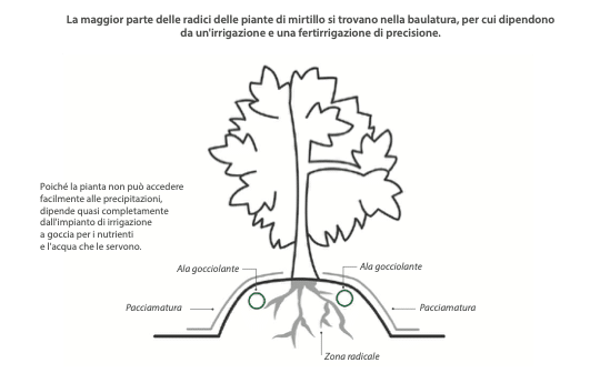 I mirtilli necessitano di 200–300 mm/ha di acqua all’anno, ma la coltura non può accedere facilmente alle precipitazioni e, poiché la maggior parte delle radici si trova nella baulatura, i mirtilli dipendono da un’irrigazione precisa e dalla fertirrigazione.