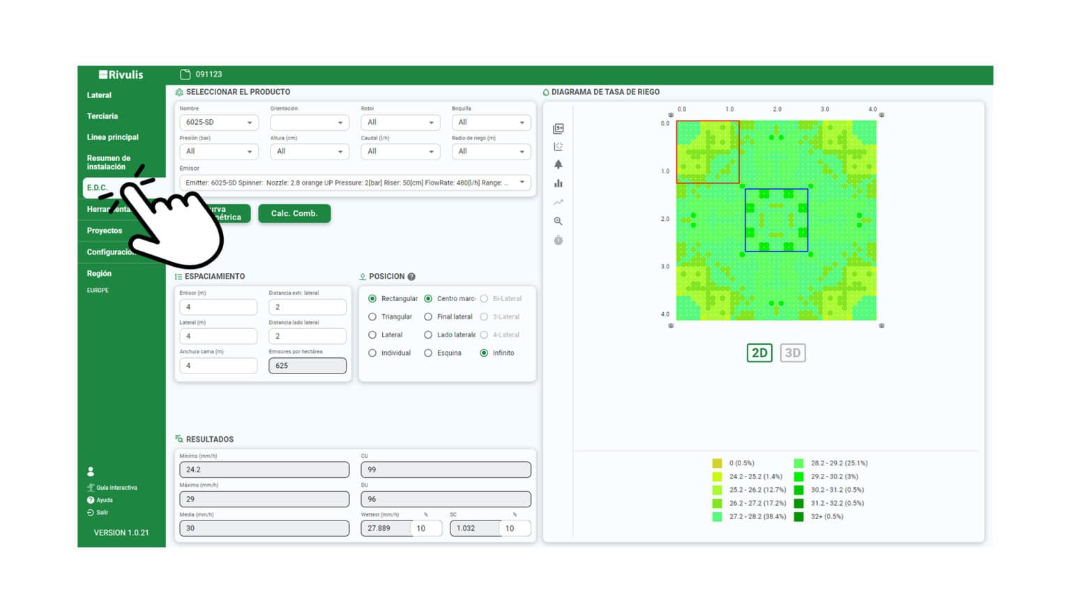 - Determinare il miglior posizionamento degli irrigatori: Ogni goccia è importante (EDC – Every Drop Counts) è una funzionalità incorporata che valuta l’uniformità di bagnatura di un sesto di irrigatori. Calcola la CU% e la DU% in base all’irrigatore Rivulis o NaanDan selezionato e alla configurazione del sesto, fornendo una rappresentazione grafica del rapporto e uniformità di irrigazione.